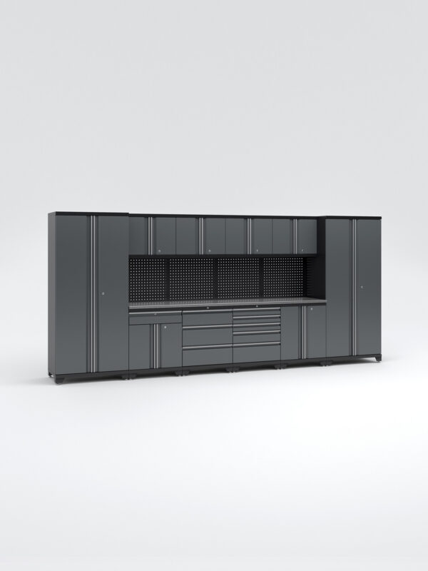 Garageinredning med 10 delar - set 1, grå, PRO är ett stort modulärt garageförvaringssystem med flera högskåp, överskåp, lådor och arbetsbänk. Den är designad i mörkgrå med en pegboard backsplash för effektiv verktygsorganisation och utrymmesoptimering.