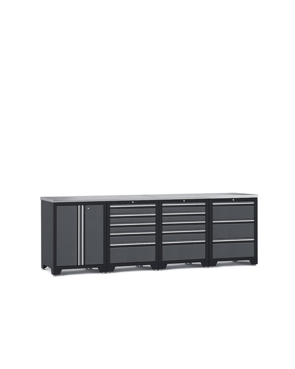 Garageinredning med 4 delar – set 2, grå, CLASSIC är ett modulärt industriellt förvaringsskåpsset med metalliska tvådörrarsskåp och flera lådor, med vertikala och horisontella handtag. Den vilar på en plan yta och är idealisk för verkstäder.