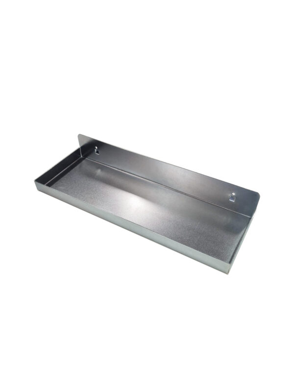 1st avställningshylla som mäter 35 i bredd och 11cm i djup. Uppvikta kanter runt om och passar våra verktygstavlor eller andra med hålbild 10mm fyrkantshål i cc38mm.