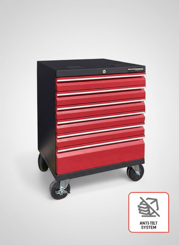 Högkvalitativ verktygsvagn i som är anpassad måttmässigt att ersätta ett golvskåp. Försedd med hjul som gör det enkelt dra ut vagnen till din arbetsplats och därefter styra in den under arbetsbänken igen. De sex lådorna ger gott om förvaringsutrymme för dina verktyg.